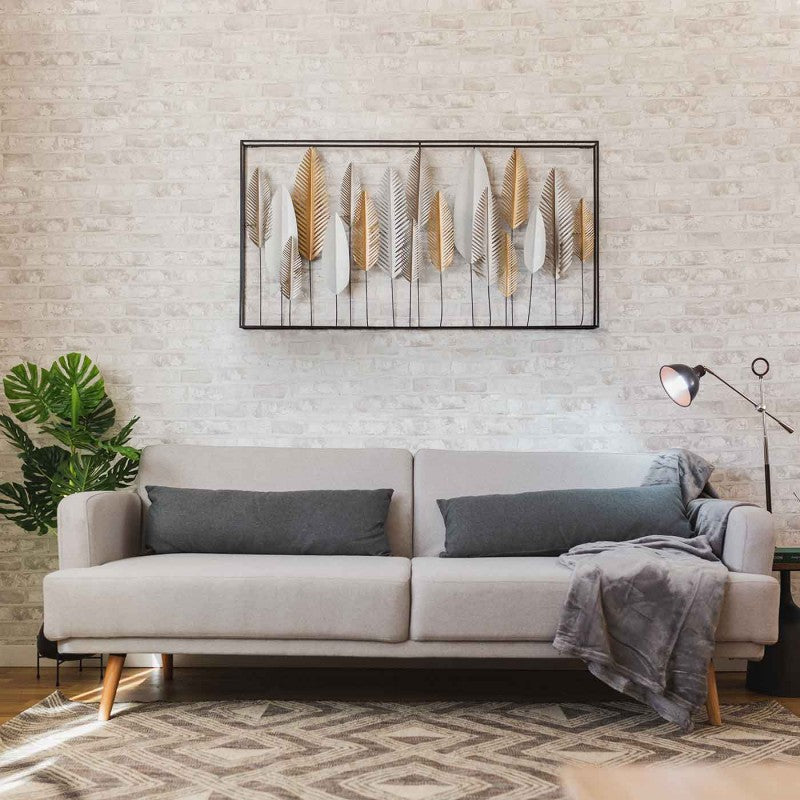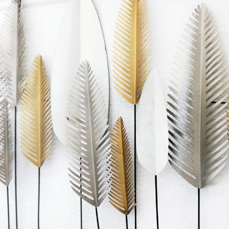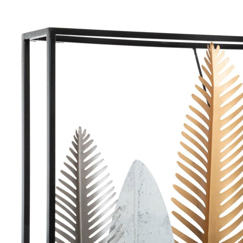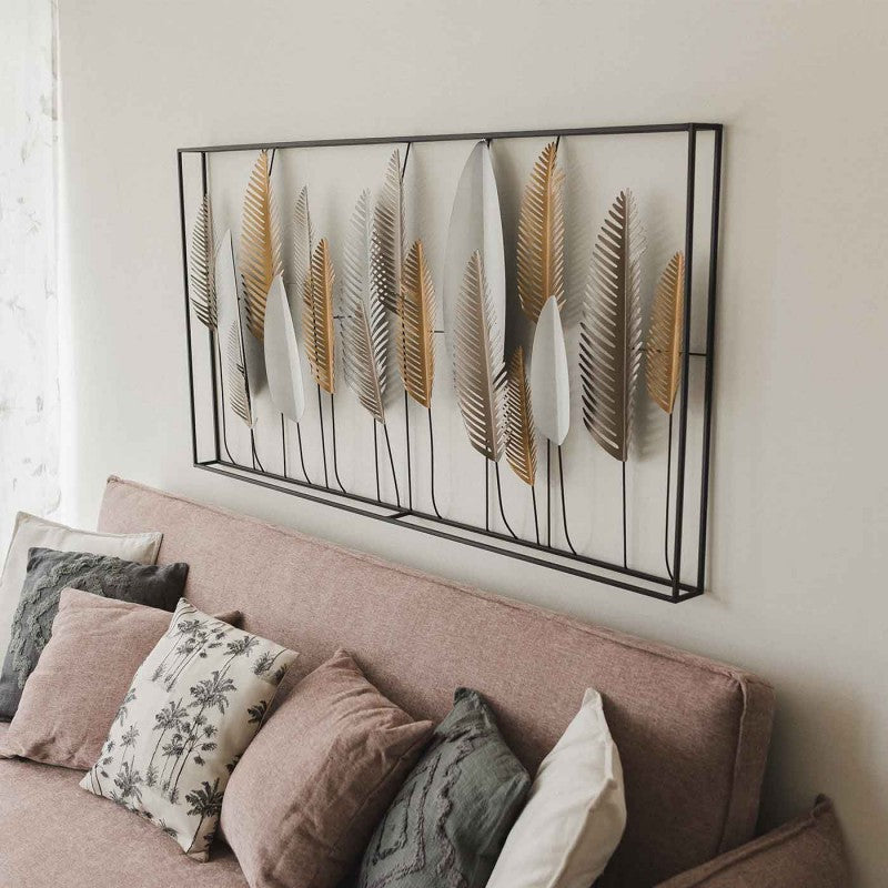 Panneau en métal de 134x68cm avec des feuilles argentées, dorées et blanches. Un superbe panneau métallique pour habiller vos murs. Il sera le centre de tous les regards!